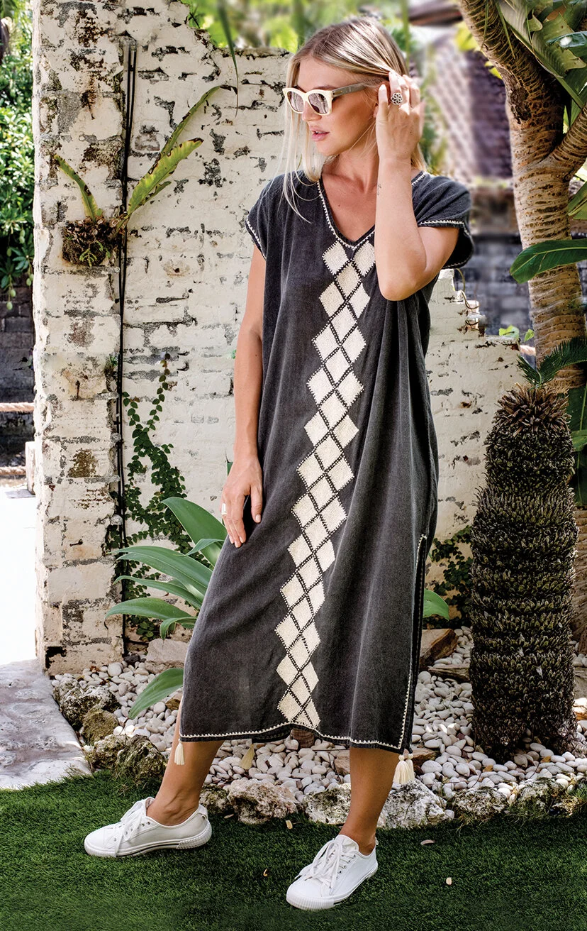 3/4 bell slv bloused top, elastic waist maxi dress, beaded v-neck