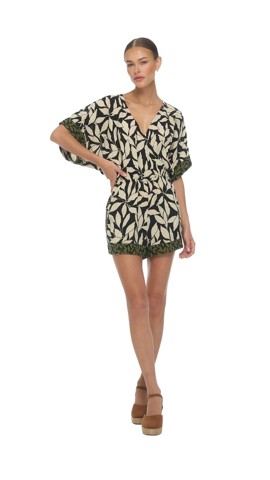 Surplice front, elasticized high-waist, elastic cuff 3/4 slv, side pkt romper
