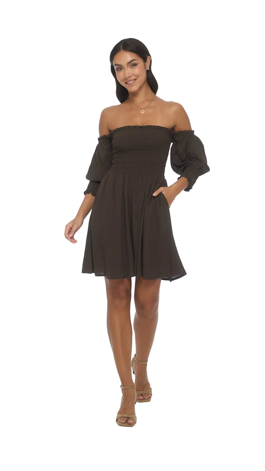Strapless smocked bodice, smocked cuff 3/4 slv, side pkt short dress