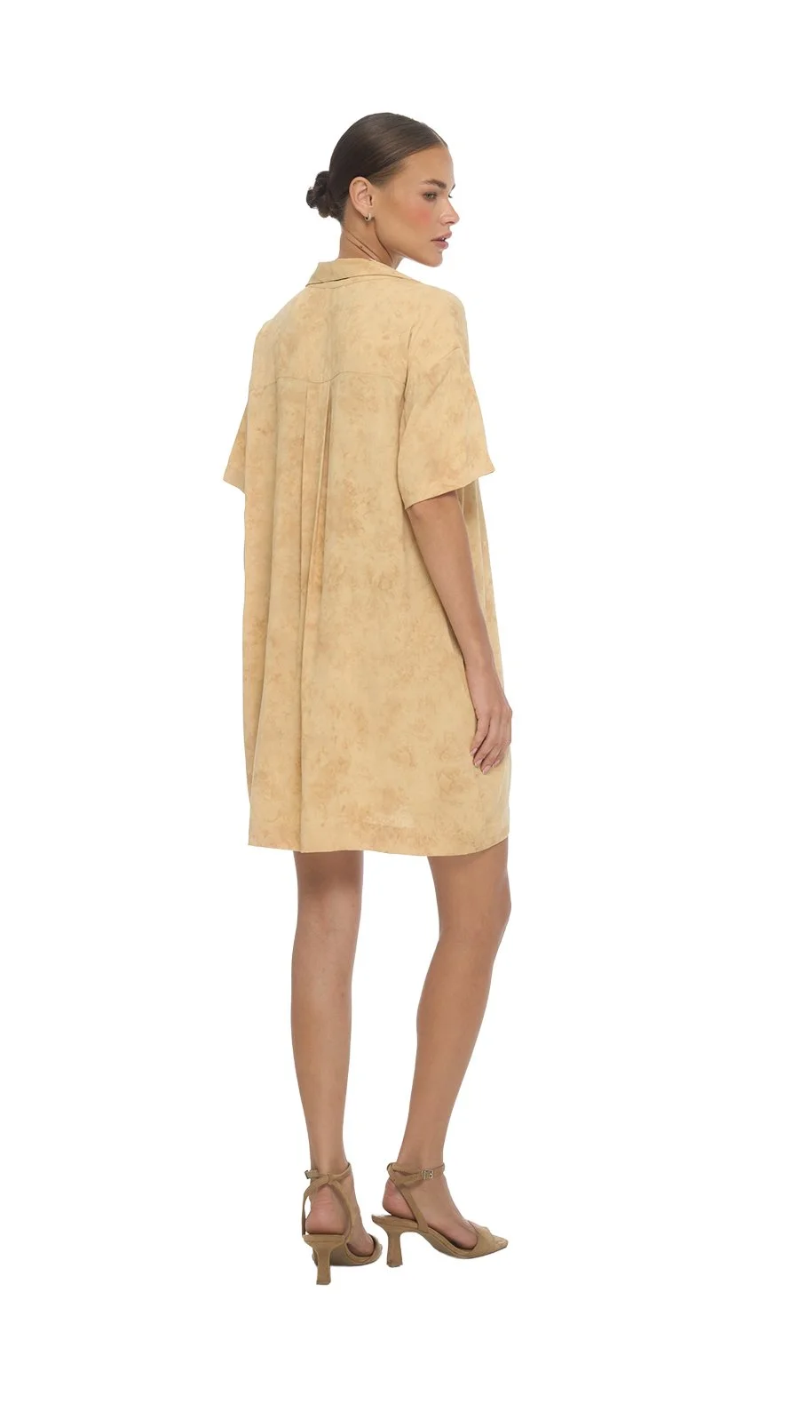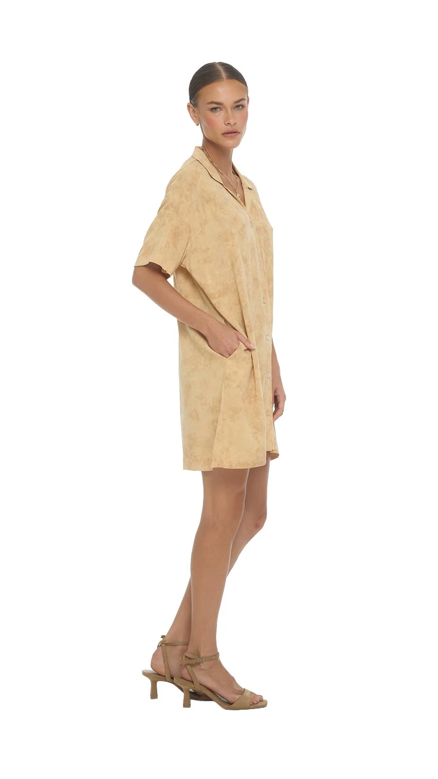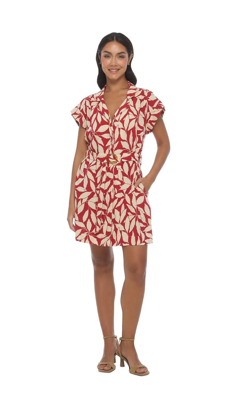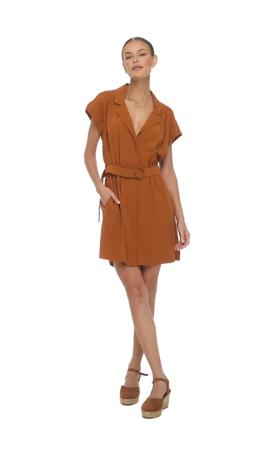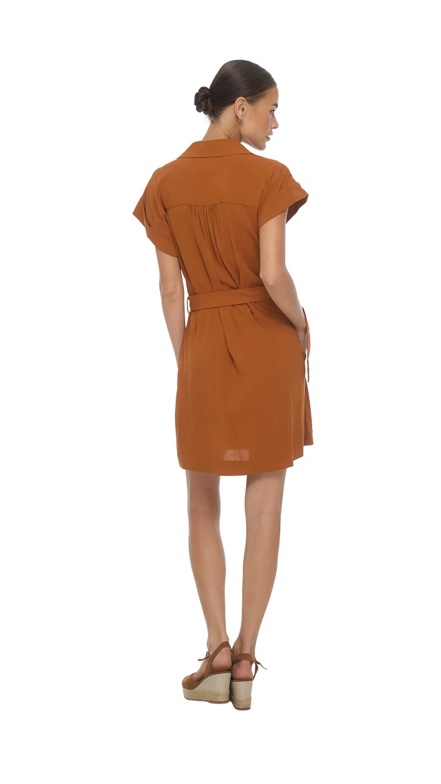Shirt style collar short dress, short slv, side pkt, front closure w/ buttons, detachable adj belt w/ loops