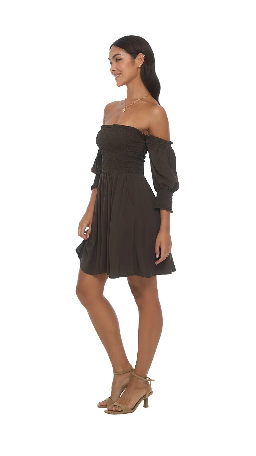 3/4 slv w/ smocked cuff, elasticized on shoulder, smocked bodice w/ front ties, side pkt, short dress