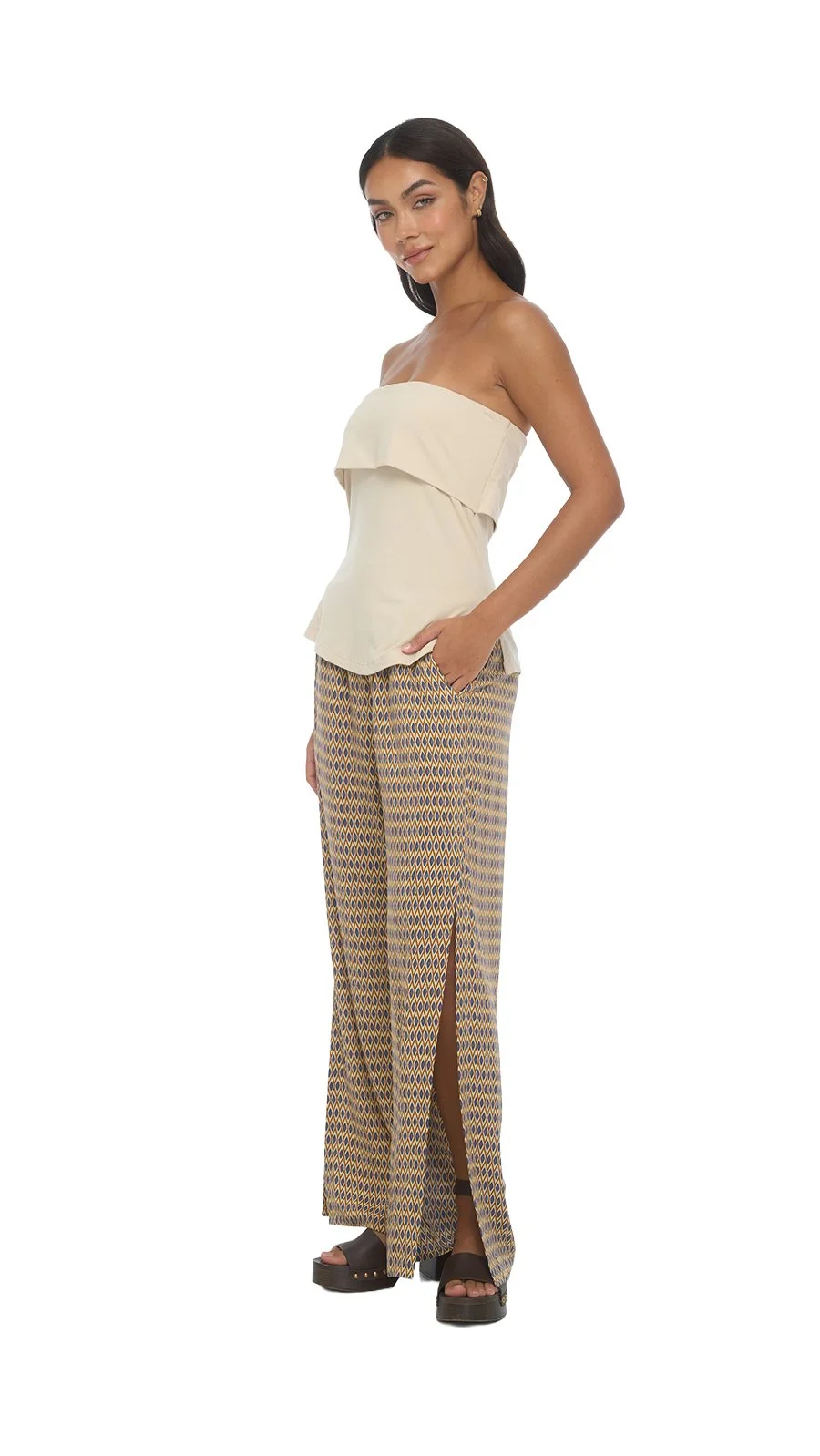 Smocked high waist pant, wide leg, side slash pkt, side slit pant
