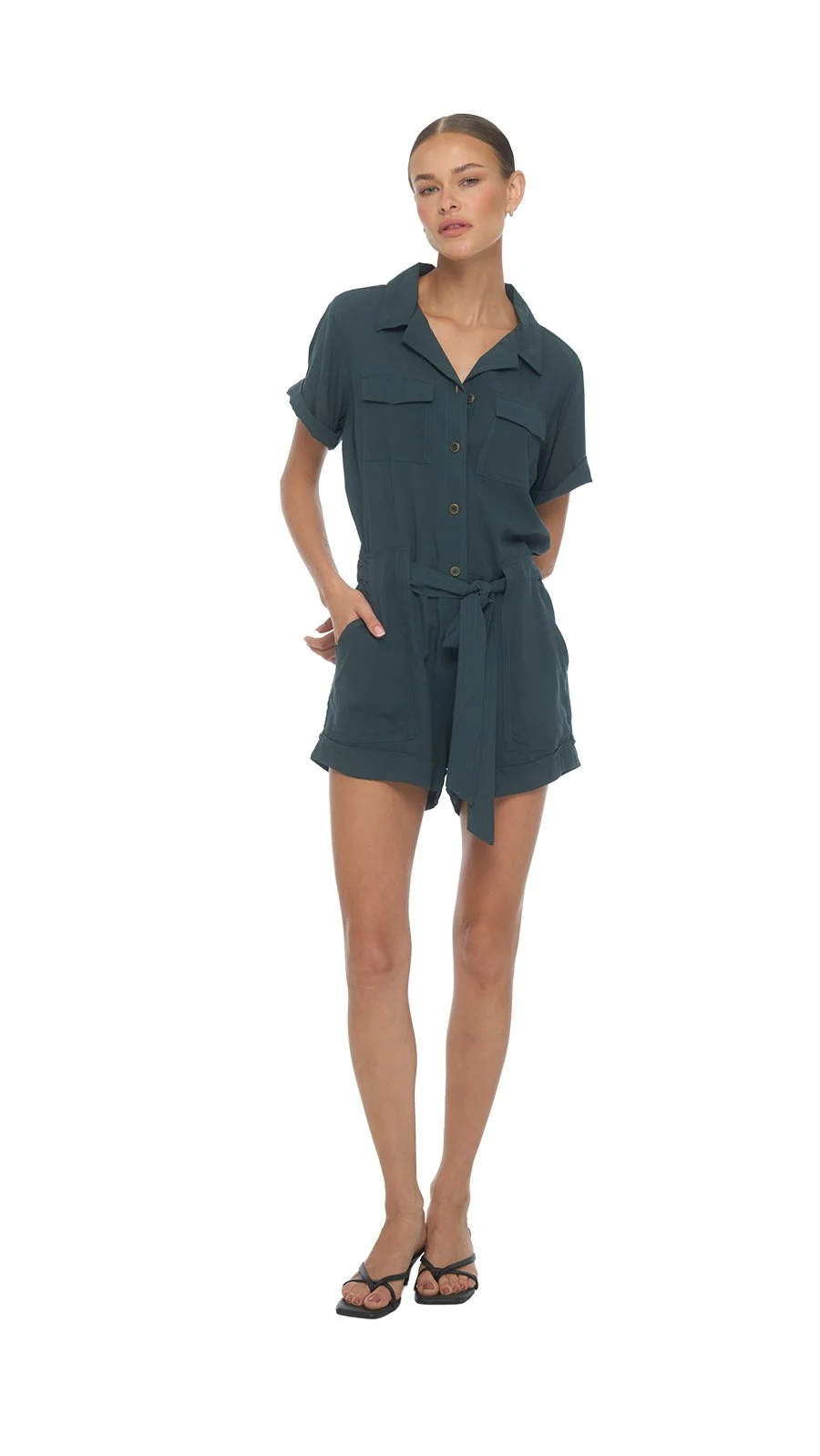 S/s high-waist collar cargo romper, front pkt, waistband tie belt
