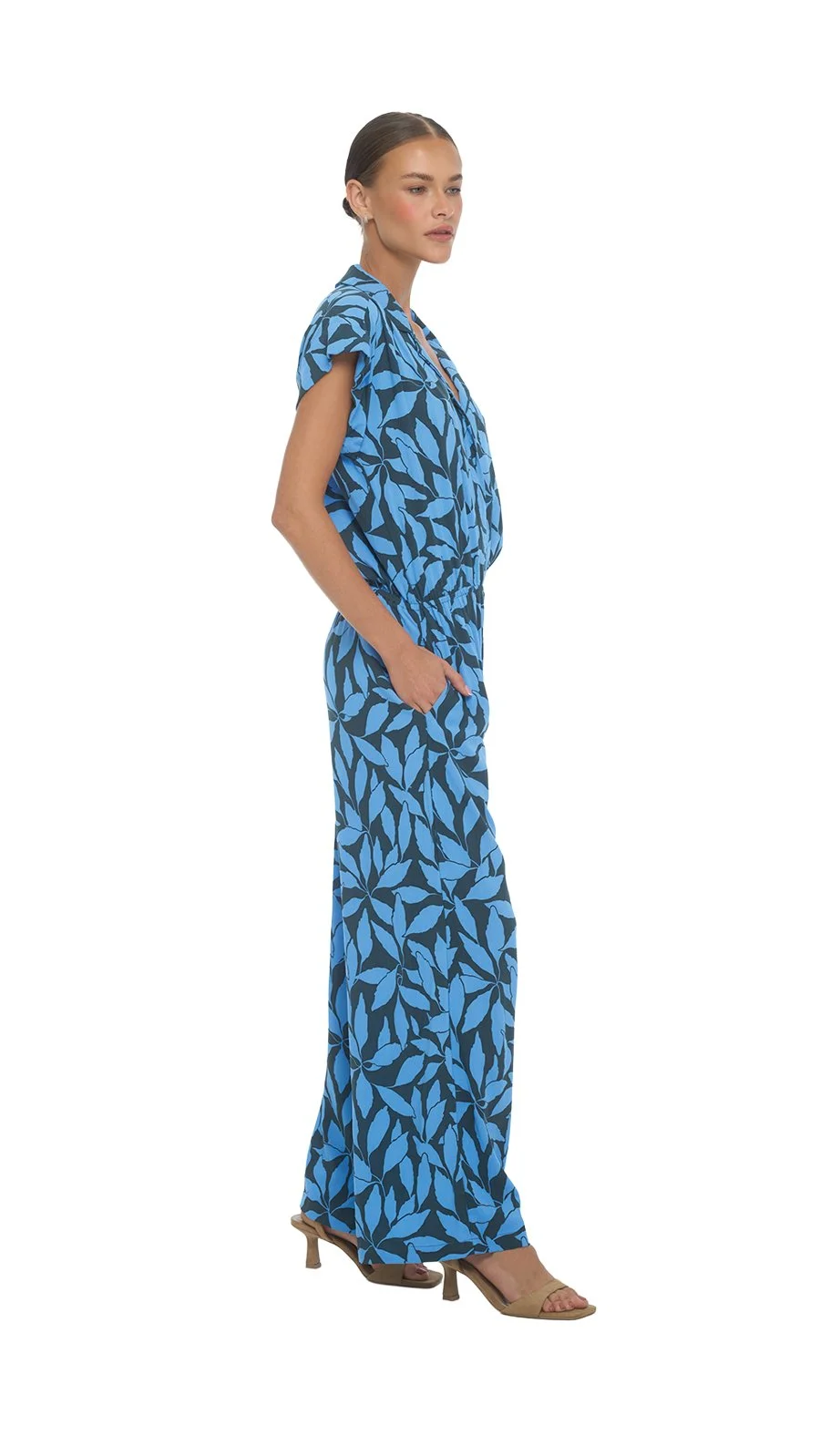 Adj shoulder strap, rounded v-neck, front dart fitted bodice, smocked back, side pkt, wide leg jumpsuit