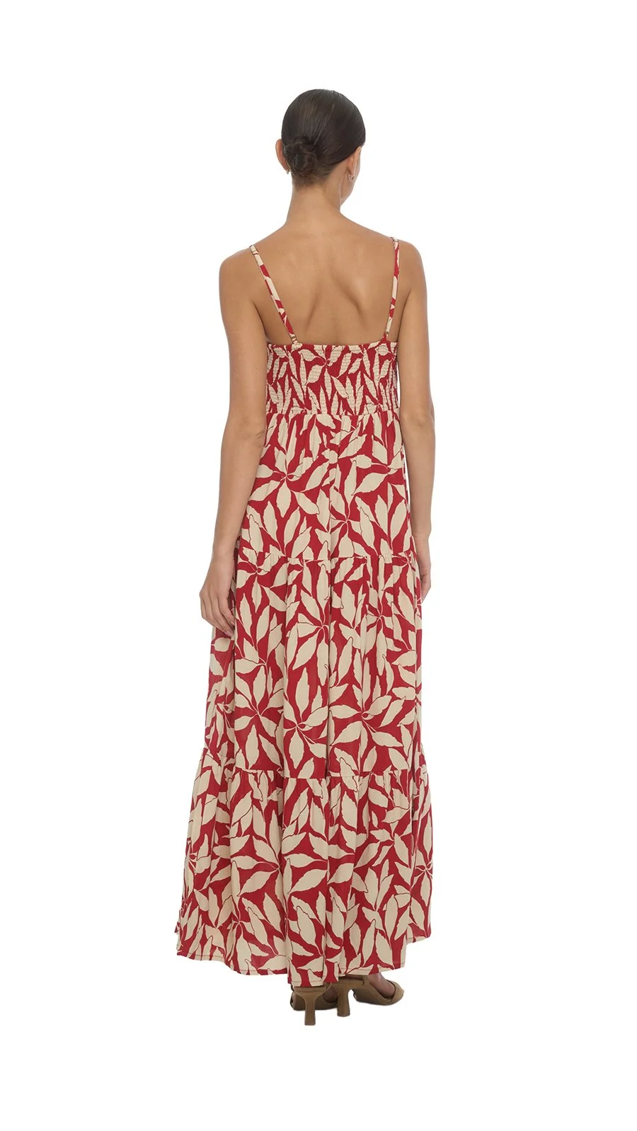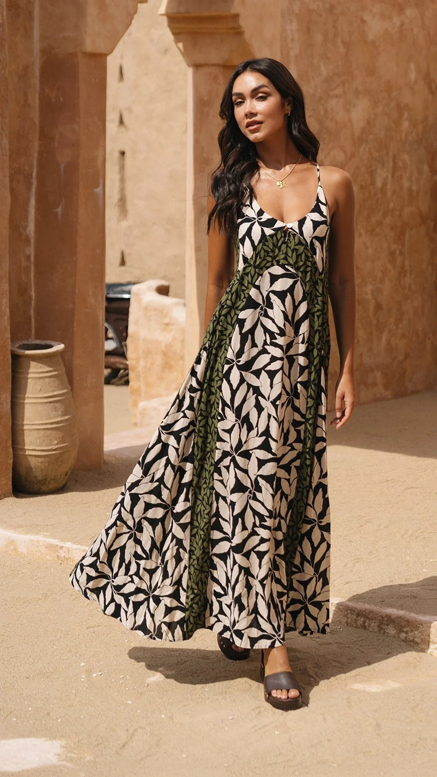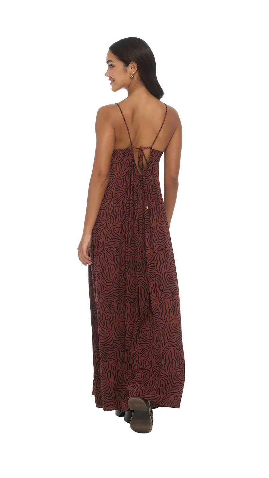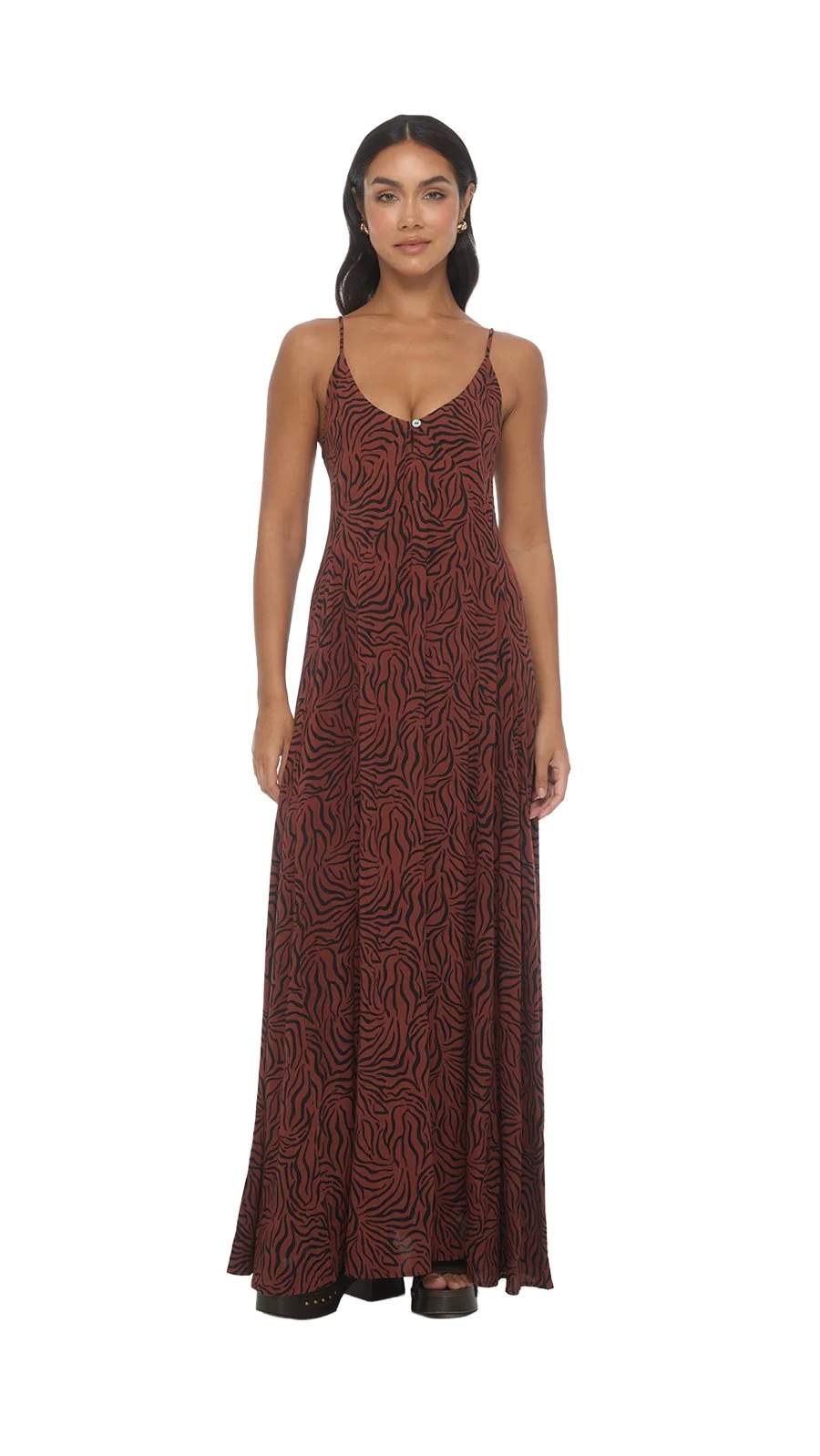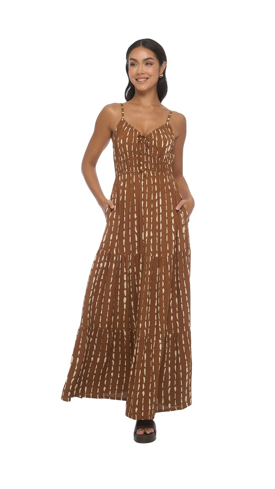 Spaghetti strap with adj tie back ties, v-neck w/ button closure detail, round cut panels, keyhole front detail maxi dress