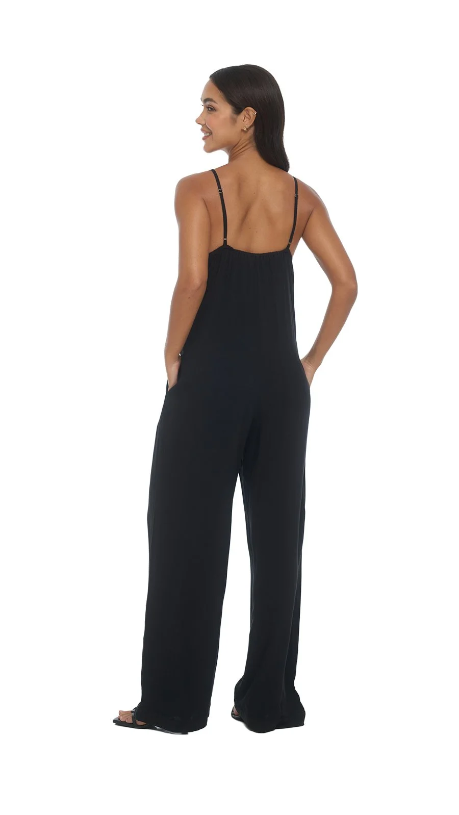 Adj shoulder strap, pleated detail cup, straight leg, back elastic, side pkt jumpsuit