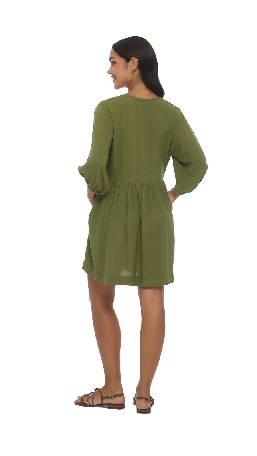 V-neck 3/4 elasticized cuff slv, side pkt short dress