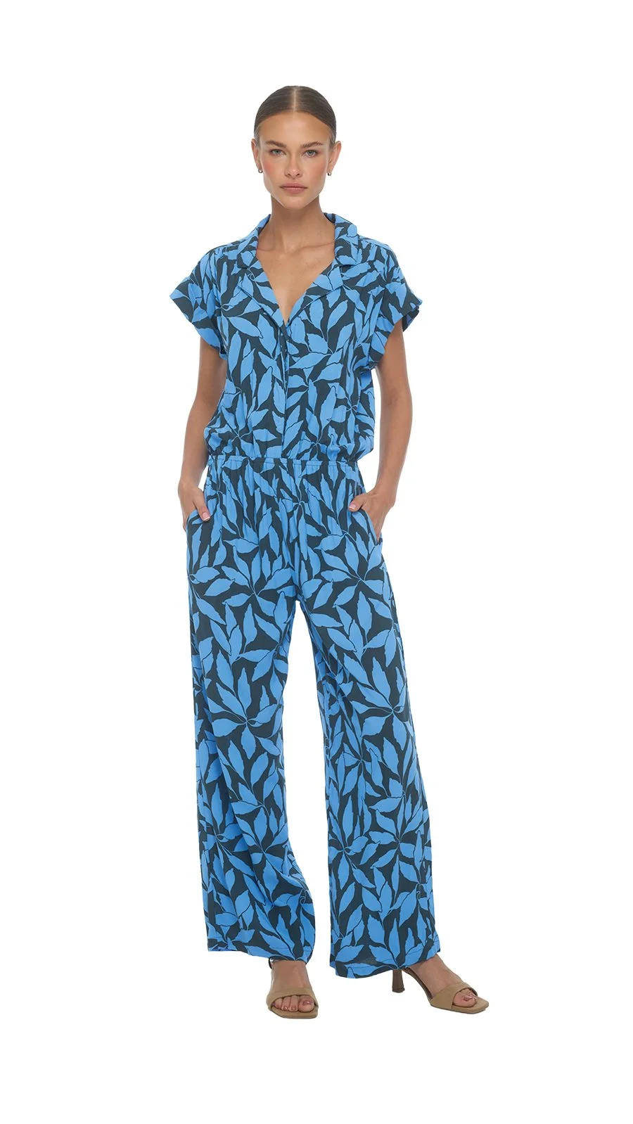 Shirt style collar, short slv, side pkt, front closure w/ buttons, elastic waist jumpsuit