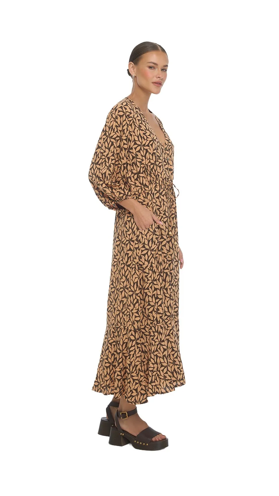3/4 slv elasticized cuff, v-neck, front ties w/ wood trim, bottom tired flowy maxi dress