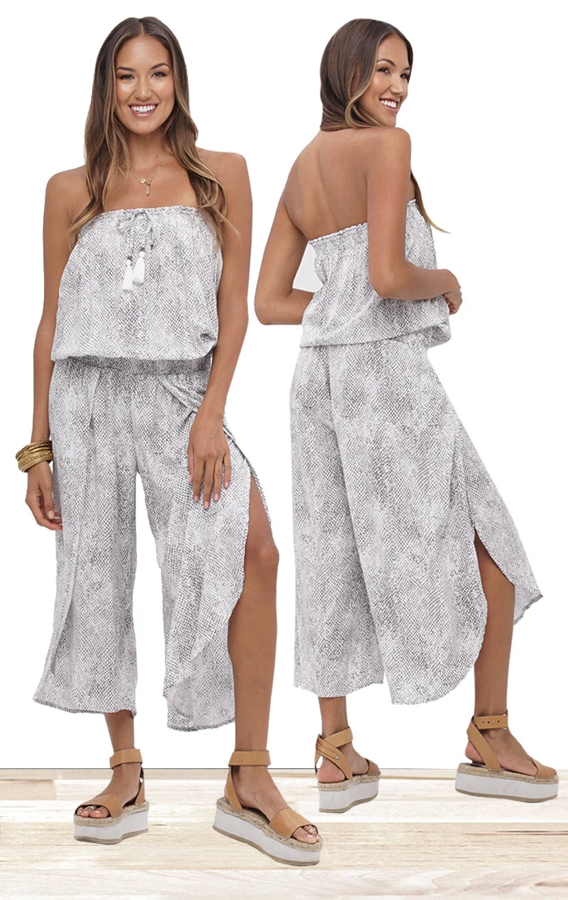 Strapless w/ tasseled ties, wrap style leg, elastic waist, midi length jumpsuit